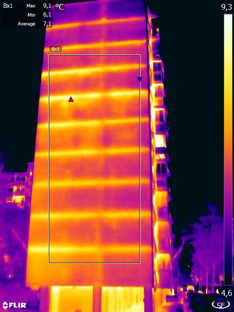 Esta imagen termográfica de una fachada, demuestra, con diferencia, las pérdidas de calor que se producen por los forjados, generando un mayor consumo de energía en calefacción para mantener la vivienda a la temperatura adecuada.